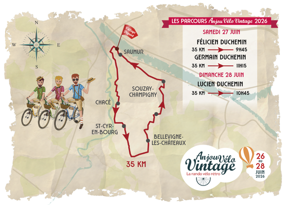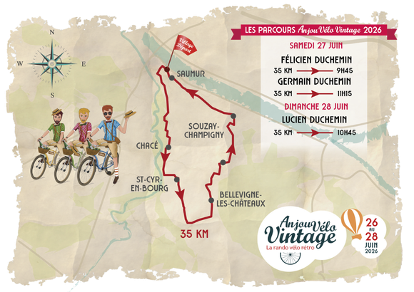 Amoureux de la nature, les frères Duchemin vous invitent sur un parcours entre vignes et clos de tuffeau. La convivialité règne sur cette randonnée champêtre ! Comme Félicien, Germain et Lucien, assurez-vous d'avoir des pneus assez robustes pour résister aux chemins de cailloux qui serpentent entre les vignes.